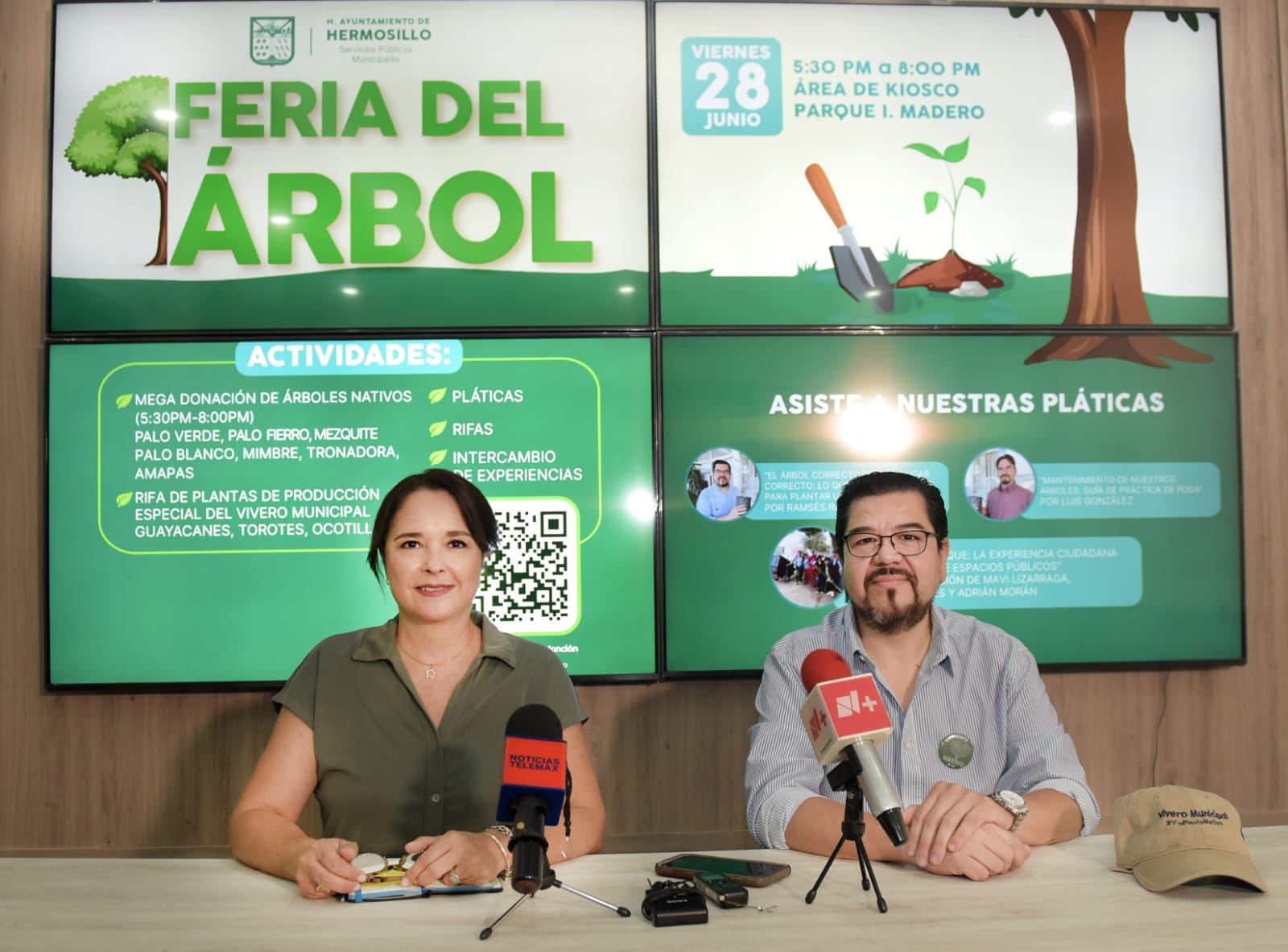 Amparo Fontanot, directora general de Parques y Jardines y Ramsés Rodríguez, técnico especialista en plantas nativas del Vivero Municipal, anunciaron la edición de este año de la Feria del Árbol e invitaron a la comunidad en general a acudir al área del Kiosco del Parque Madero y llevarse un arbolito, o bien participar en el sorteo de 30 especies de producción especial como guayacanes, torotes y ocotillos.