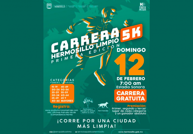 La invitación es este domingo 12 de febrero a las 7:00 horas para una carrera de 5 kilómetros con salida del Estadio Sonora al Ecoparque y de regreso, recorrido en el que se tendrán alusiones a la limpieza de la ciudad y al servicio que se presta; también habrá varios puntos donde se podrá llevar material reciclable.