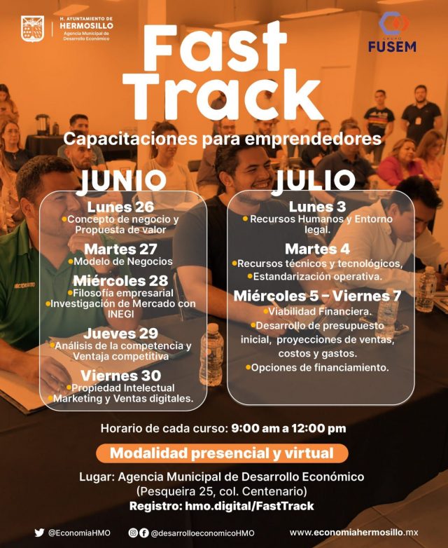 El Gobierno Municipal de Hermosillo, a través de la Agencia Municipal de Desarrollo Económico (AMDE), invita a todas las personas con vocación emprendedora a que participen en el programa de incubación y fortalecimiento de empresas nacientes a que se capaciten a través del programa Fast Track.