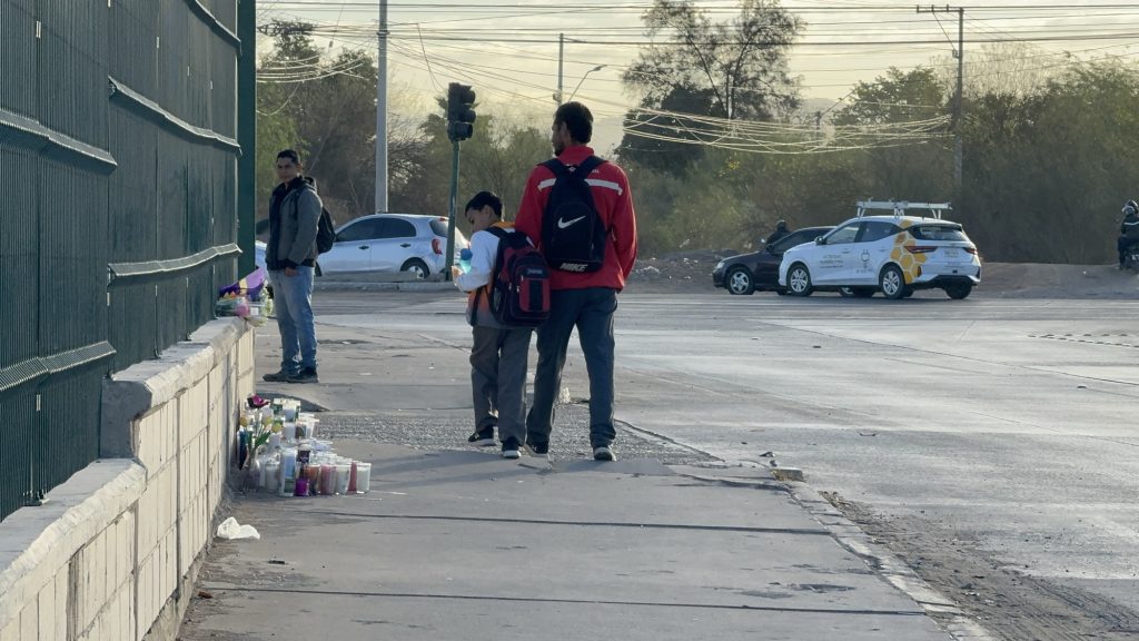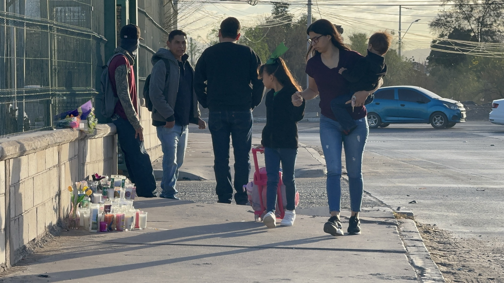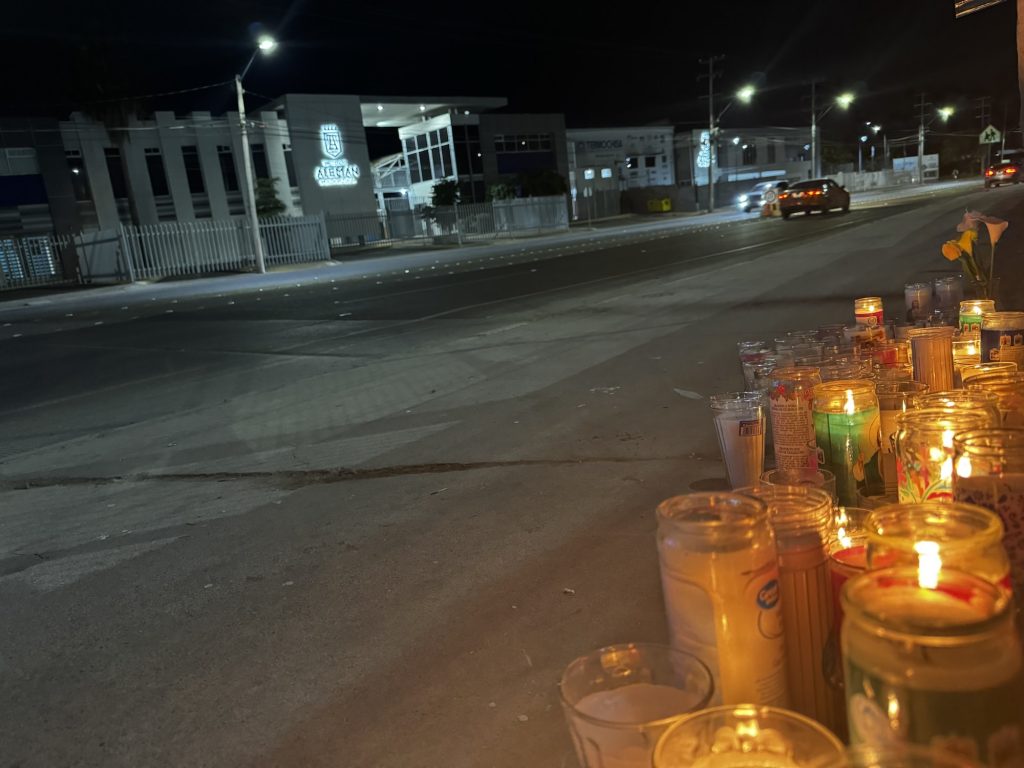 En el lugar, a pocos metros de la escuela, en la banqueta de enfrente, un altar improvisado con fotos, veladoras y flores como muestra de cariño a Mayra y Perla es observado por los pocos alumnos que asistieron hoy a clases. Acompañados de sus padres y madres, se detienen a observar y se alejan con la mirada puesta en el altar, ubicado a pocos metros de la puerta del estacionamiento del centro comercial donde ocurrieron los hechos.