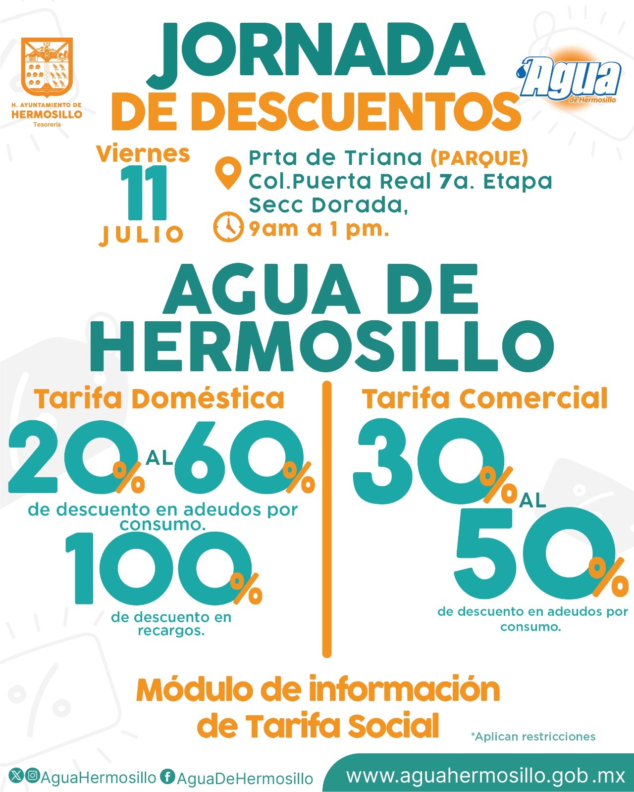 Agua de Hermosillo llevará a cabo una jornada de regularización este viernes 11 de julio en la Séptima Etapa de la colonia Puerta Real, Sección Dorada, específicamente en el parque Puerta de Triana, en un horario de 09:00 a 13:00 horas.