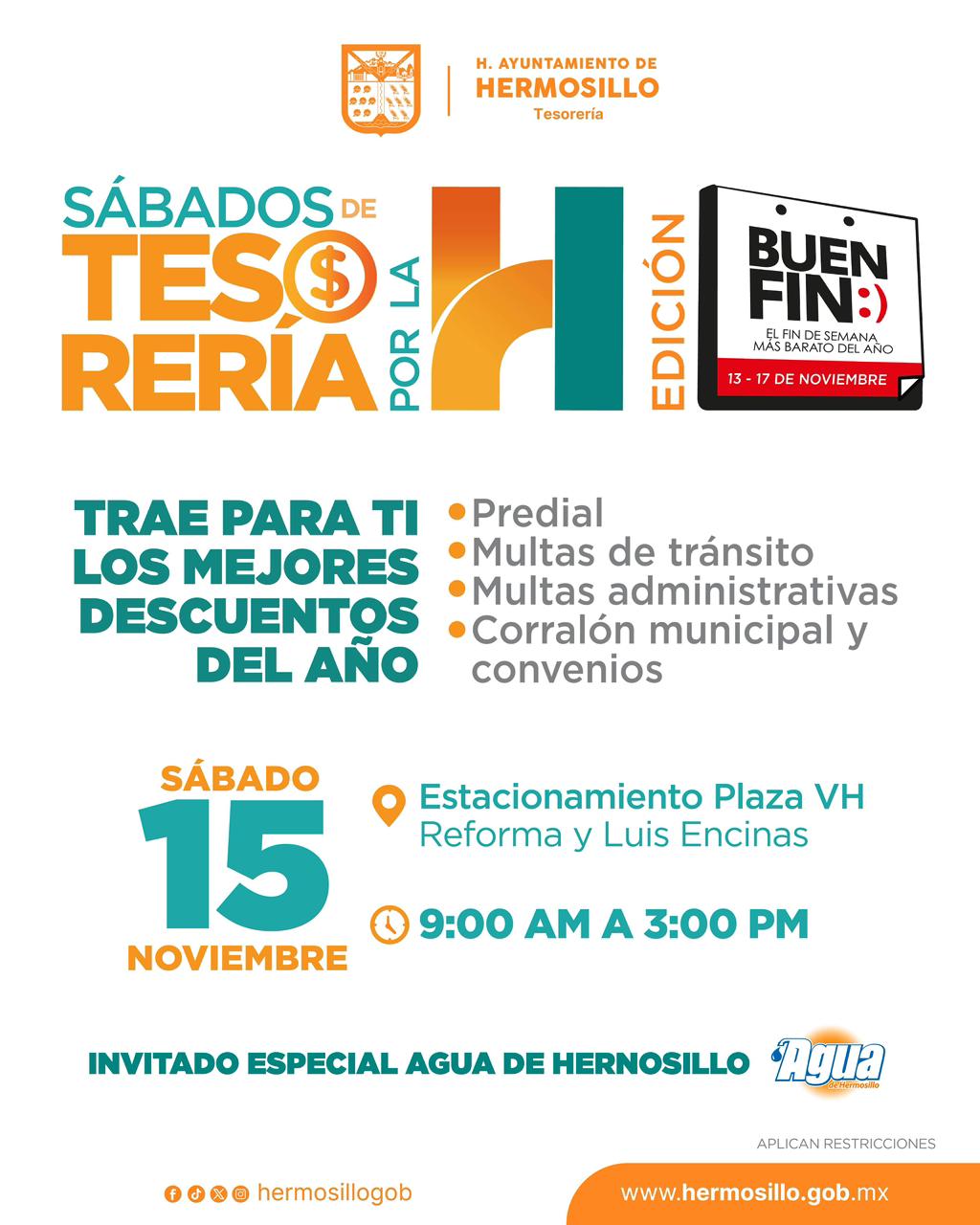 El Gobierno Municipal invita a aprovechar la jornada de descuentos que se realizará este sábado 15 de noviembre de 9:00 de la mañana a 3:00 de la tarde en el estacionamiento de Plaza VH ubicado en Reforma y Luis Encinas.