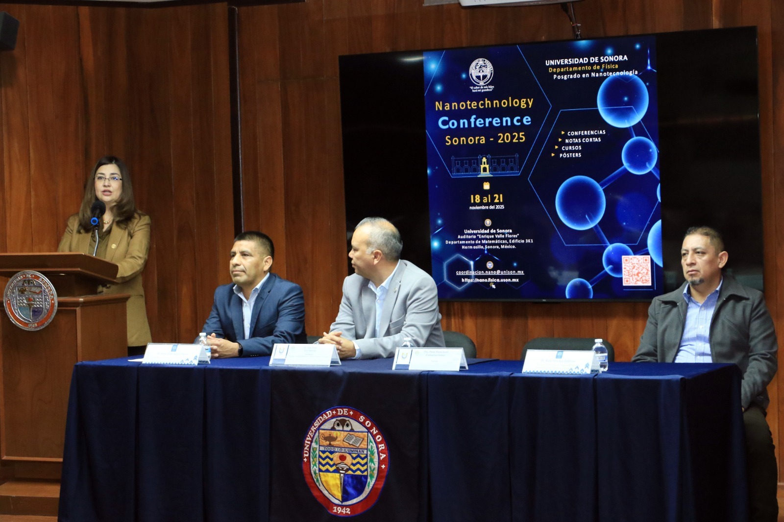 A inaugurar los trabajos de la Nanotechnology Conference Sonora 2025, la rectora destacó que la institución abona a las disciplinas como física, matemáticas, biología, electrónica y nanotecnología, que son espacios de vanguardia en la divulgación de los conocimientos que generan atendiendo los retos globales de la humanidad.