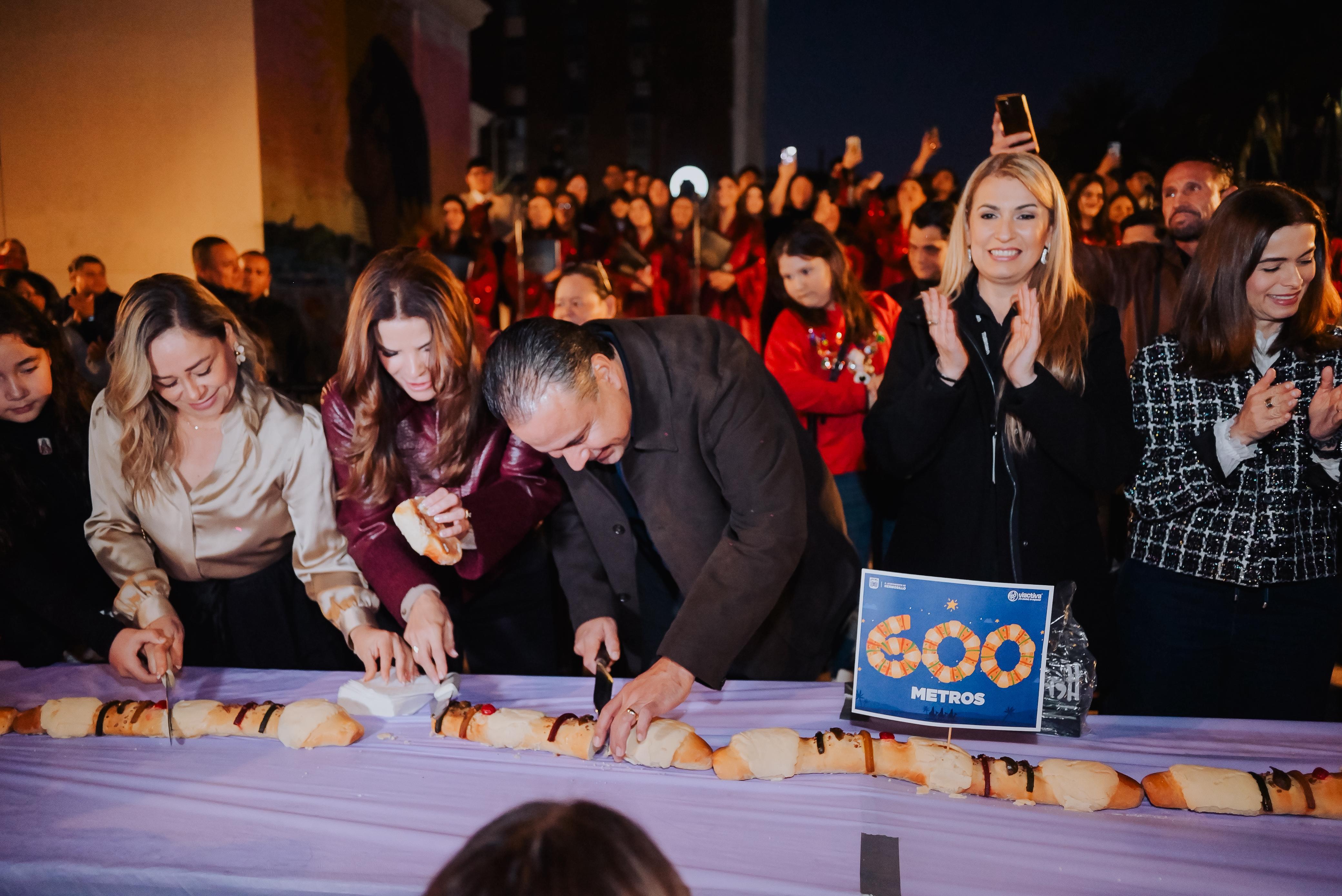 Toño Astiazarán y Patty Ruibal recorrieron la Rosca de Reyes gigante, que fue marcada en intervalos de 50 metros, junto con Karla Fabiola López Bañuelos, directora general de la Universidad Vizcaya de las Américas (UVA), campus Hermosillo; Oscar Gastélum Donnadieu, director de la Agencia Municipal de Desarrollo Económico (AMDE) y Fernanda Cisneros Rodríguez, directora de Desarrollo Económico de la dependencia municipal.