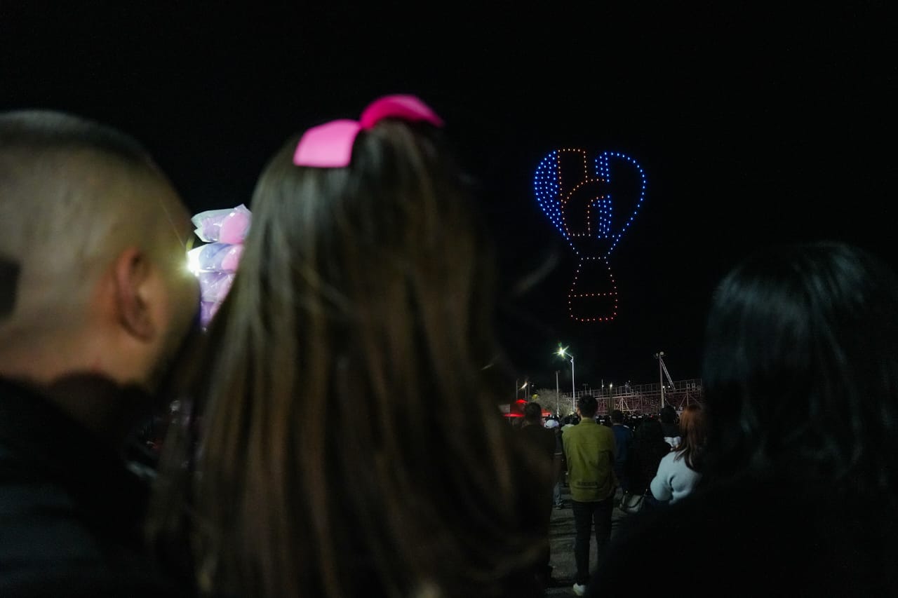 Las y los asistentes del domingo en el Festival del Globo disfrutaron también de un espectacular show protagonizado por 200 drones que iluminaron el cielo con figuras representativas de la identidad de Hermosillo.