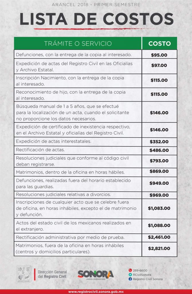 Es decir, la emisión de un acta de forma normal cuesta en Sonora 95 pesos si se requiere la copia a los interesados. Pero si el trámite se realiza fuera de horario el costo aumenta hasta 949 pesos. Estos precios son vigentes hasta el mes de junio de 2018 y están publicados en la ley de hacienda.
