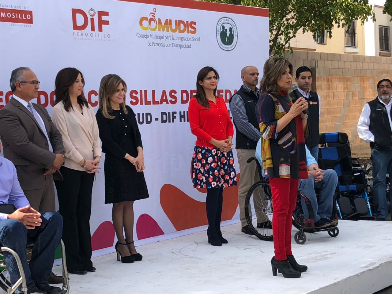 La Presidenta de Hermosillo, Angelina Muñoz Fernández, acompañada de la Presidenta honoraria del Patronato del DIF Hermosillo, Martha Antúnez de Acosta y de José Alfredo Sanudo Urrea, Presidente del Centro Estaca Hermosillo, así como de cientos de niños, jóvenes y adultos beneficiados con esta sillas de ruedas, agradeció esa donación, porque resaltó, le habrá de cambiar la vida a 530 personas que contarán con una nueva silla de ruedas.