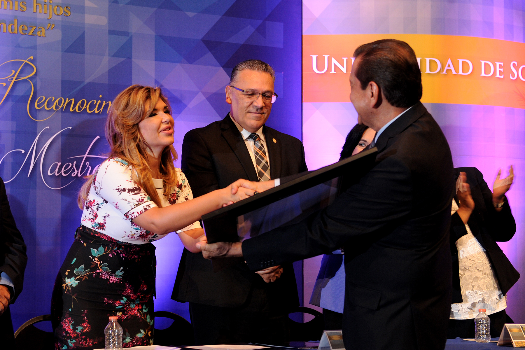 Además, Everardo Oloño León, Guadalupe García de León Peñúñuri, Rosa María Montesinos Cisneros, Adriana Leticia Navarro Verdugo, María Rita Blancarte Martínez, Luis Enrique Riojas Duarte, Presidente de la Junta Universitaria, Secretaria General Académica; Secretaria General Administrativa, Vicerrectora de la Unidad Regional Sur, Vicerrectora de la Unidad Regional Centro, Vicerrector de la Unidad Regional Norte de la Universidad de Sonora, respectivamente.