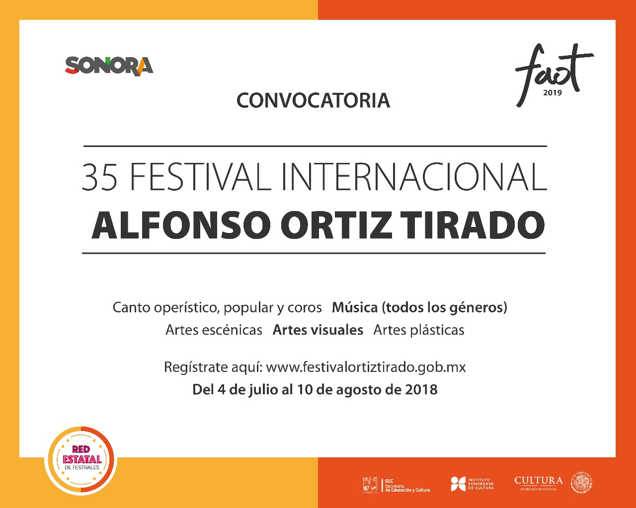 *Dirigida a creadores, grupos, compañías artísticas, productores y promotores culturales Hermosillo, Sonora, julio 4 de 2018.- El Instituto Sonorense de Cultura (ISC), a través de su Director General, Mario Welfo Álvarez Beltrán, anunció que está abierta la convocatoria para el Festival Internacional Alfonso Ortiz Tirado (FAOT), a realizarse del 18 al 26 de enero de 2019. Para este evento, considerado el más importante del noroeste del país en su tipo, dijo, invita a artistas y colectivos de Sonora, México y el extranjero, a participar en la convocatoria de su edición 35. Ésta es dirigida a creadores, grupos, compañías artísticas, así como a productores y promotores culturales, para que registren sus propuestas vía Internet, en la plataforma FAOT en línea. La convocatoria permite proyectos de diferentes y diversas disciplinas artísticas: canto operístico, popular y coros, además de actos musicales de todos los géneros; propuestas de artes escénicas: danza, teatro y performance; artes visuales: arte urbano, digital, fotografía, instalación o video, y de artes plásticas: escultura, dibujo, pintura, cómic. Las personas interesadas deberán realizar su aplicación mediante su registro en el portal del FAOT en línea, en el sitio oficial www.festivalortiztirado.gob.mx Álvarez Beltrán remarcó que el periodo de registro y carga en línea inicia el miércoles 4 de julio, hasta el viernes 10 de agosto de 2018, plazo que vence a las 15:00 horas de la fecha de cierre, horario del Pacífico. La selección de resultados para el FAOT 35 se publicará en la página del ISC www.isc.gob.mx y en la página web del Festival, en el mes de septiembre 2018. La resolución del Comité Organizador será inapelable. Cualquier asunto no previsto en la convocatoria será resuelto por el Comité Organizador del Festival. Para más informes, comunicarse a la Coordinación FAOT del ISC, de lunes a viernes de 10:00 a 14:00 horas en días hábiles, o al teléfono (662) 213 4411, extensión 227, o bien, al correo soportetecnico@isc.gob.mx. |