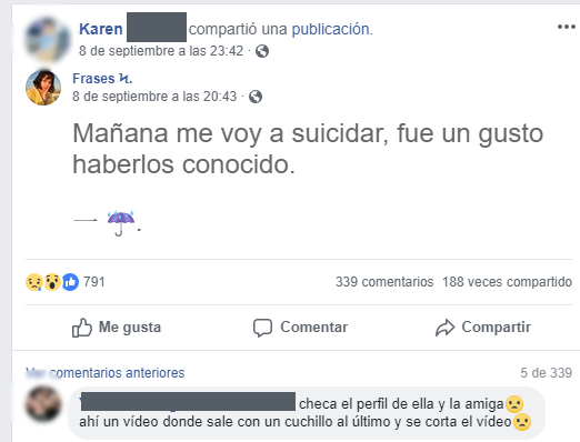Así versa el mensaje que Karen de 14 años posteó en su cuenta de Facebook el sábado en la noche cerca de las 11 con 42 minutos. La amenaza fue cumplida a las 4 de la mañana cuando en el número de emergencias se recibió el reporte de una mujer que intentaba quitarse la vida en la Colonia Los Arroyos en Hermosillo. Otra llamada confirmaba que había logrado su cometido. Sus amigos, otros menores de edad la encontraron de acuerdo a las versiones extraoficiales y publicaciones en redes sociales de las mismas compañeras de la menor que dejó varios mensajes previos a la hora del deceso que sugerían pasaba por una decepción amorosa.