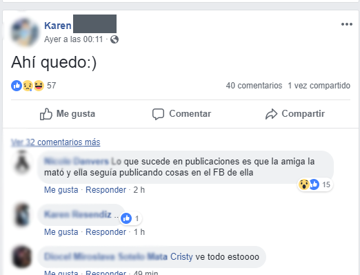 A pesar de las distintas publicaciones que llamaban la atención en las últimas semanas donde a través de una carta la joven detalla el dolor que le ha causado un rompimiento sentimental y consecuentes donde hablaba de su estado de ánimo deprimido, los likes pudieron más que una solicitud de ayuda. Al parecer nadie se percató de lo que pasaba por su mente y que derivó en un supuesto suicidio porque hasta el momento no hay una versión oficial por tratarse de un caso de una menor de edad. Se sigue una investigación y mientras era sepultada los comentarios sin tacto y faltos de sensibilidad siguen apareciendo en el perfil de Karen que solo es un caso como muchos que hay y que la falta de atención hace que las estadísticas sigan creciendo.