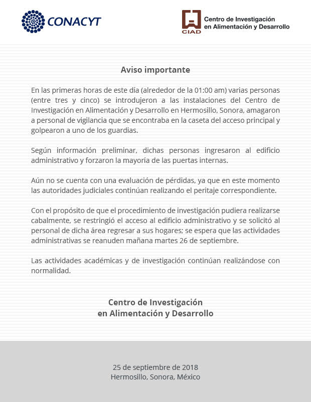 A través de un comunicado el Centro de Investigación en Alimentación y Desarrollo a través de un comunicado explicó que fueron vista de un asalto en sus instalaciones por lo que tuvieron que cerrar el acceso. Aunque no se reportaron personas afectadas ni heridas, hubo daños en las instalaciones.