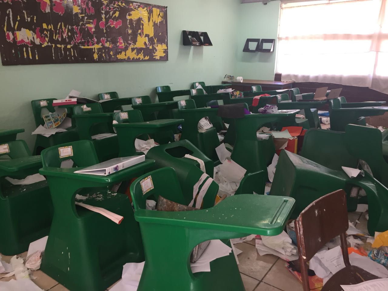 Mesabancos, pintarrones, libros, entre otros artículos quedaron esparcidos por el aula, por alumnos que asistieron a clases el viernes por la tarde.