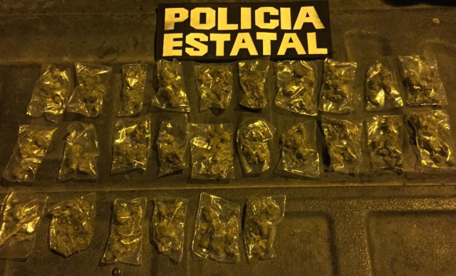 El aseguramiento se registró durante la primera hora del día al sorprender a la persona en posesión de una bolsa tipo cangurera donde traía 26 envoltorios confeccionados en plástico, conteniendo hierba verde, similar a la marihuana.