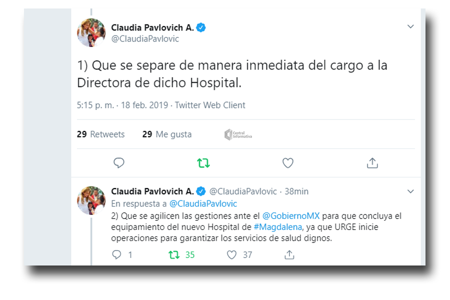 La Gobernadora de Sonora Claudia Pavlovich giró instrucciones para que la Directora del Hospital General de Magdalena, Rebeca Villa Morales fuera separada del cargo, por la denuncia de una familia que circuló en redes sociales donde explicaron que una bebé nació en un carro por la falta de atención en el hospital. Dijo que era inadmisible que se dieran estas situaciones por lo que se debe investigar los sucedido.