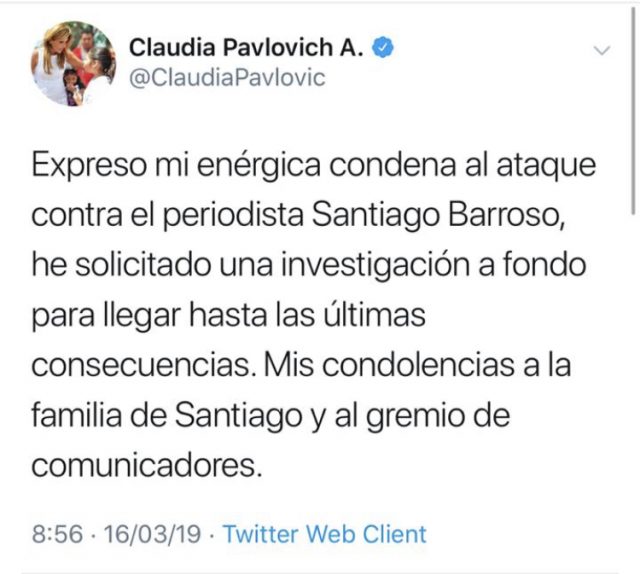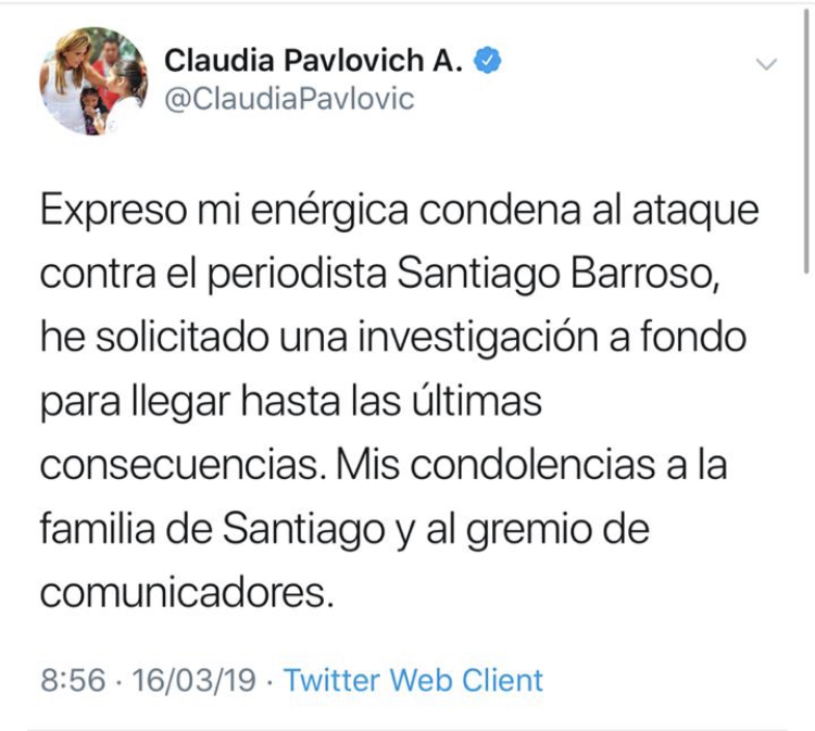 “Expreso mi enérgica condena al ataque contra el periodista Santiago Barroso, he solicitado una investigación a fondo para llegar hasta las últimas consecuencias. Mis condolencias a la familia de Santiago y al gremio de comunicadores”, suscribió la mandataria estatal en su cuenta de Twitter @ClaudiaPavlovic.