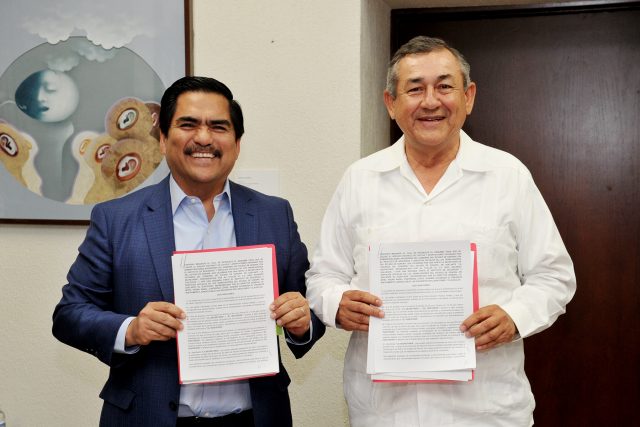 Presentes en la firma de convenio, Natalia Rivera Grijalva, jefa de la Oficina del Ejecutivo Estatal; Carmen Carballo Cabanillas, coordinadora ejecutiva de la Comisión Estatal de Bienes y Concesiones; Ramón Moya Grijalva, auditor mayor del Instituto Superior de Auditoría y Fiscalización; e Iván Jaimes Archundia, consejero jurídico del Gobierno del Estado.