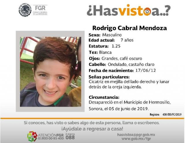Agencias de seguridad e investigación, lanzaron Alerta Amber para buscar en todo el País, al niño Rodrigo Cabral Mendoza, sustraído por su padre biológico, Ángel Cabral Martinez; aunque en un inicio la búsqueda con inició la Fiscalía de Justicia en Sonora, a 12 días de su desaparición también se sumó la Fiscalía General de la República.