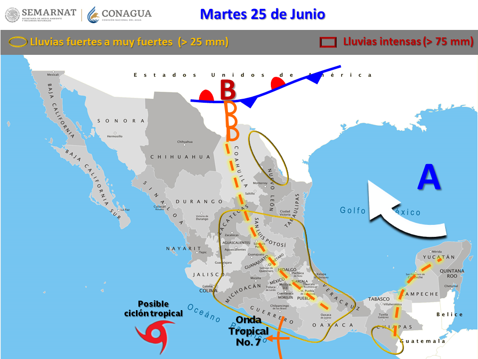 El próximo jueves en la Sierra Madre Occidental se observarán nublados dispersos de poco a fuerte desarrollo vertical, con condiciones para la formación de tormentas convectivas puntuales, que se acompañarán de precipitaciones menores de 10mm y actividad eléctrica. Se prevén algunas temperaturas máximas cercanas a 45 °C en los valles de centro, sur y oriente.