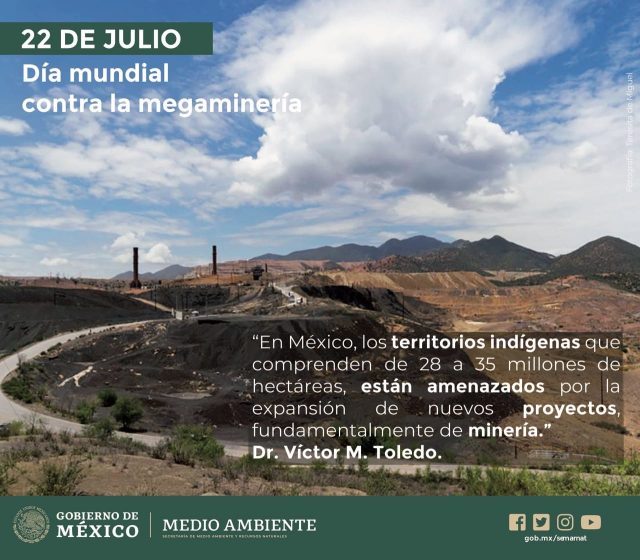 “En México, los territorios indígenas que comprenden de 25 a 30 millones de hectáreas, están amenazados por la expansión de nuevos proyectos fundamentalmente de minería”, dicta el mensaje en redes sociales como Twitter, Facebook e Instagram atribuido al doctor Víctor Manuel Toledo Manzur secretario de SEMARNAT, quien el pasado martes anunció una supervisión a la operación de Grupo México que en los últimos 20 años ha provocado 22 accidentes en su explotación minera.
