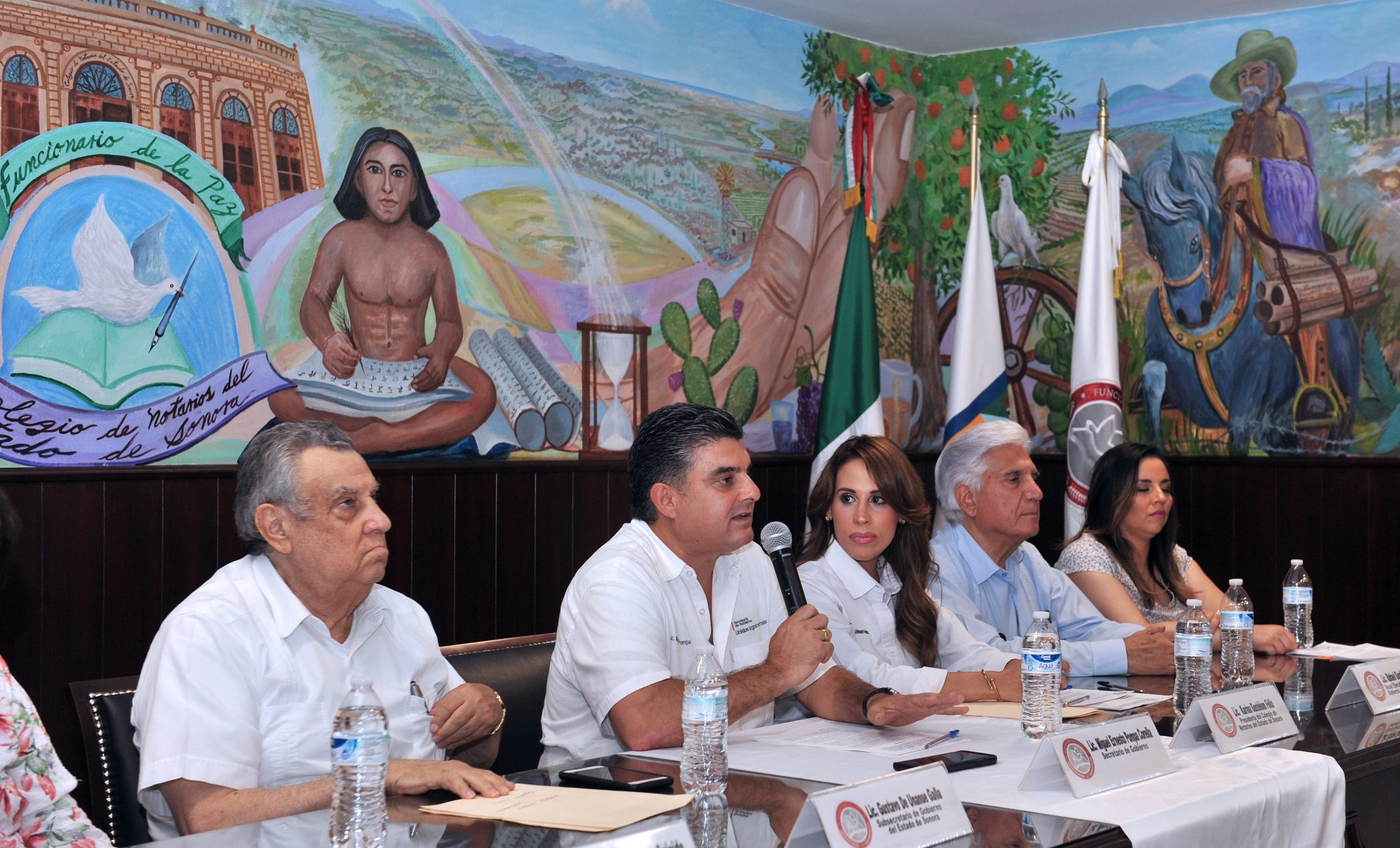 Presentes: Gustavo de Unanue Galla, subsecretario de Gobierno del Estado de Sonora; Carmen Ofelia Carballo Cabanillas, coordinadora ejecutiva de Bienes y Concesiones; Rafael Gastélum Salazar, vocal ejecutivo del Icreson; María Inés Aragón Salcido, directora general de Notarías del Gobierno del Estado de Sonora; y Juan Iván Coronado Flores, director general de Servicios Registrales.