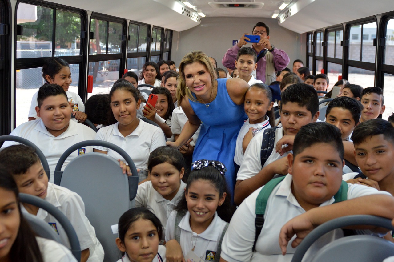 Acompañada por Víctor Guerrero González, secretario de Educación y Cultura (SEC); Yalia Salido Ibarra, coordinadora ejecutiva del Instituto Sonorense de Infraestructura Educativa (ISIE); y de Jorge Aldama Valencia, director del plantel; la gobernadora Pavlovich también entregó para Cajeme, Etchojoa y Navojoa cinco de las 40 unidades nuevas de transporte escolar que se distribuyeron en 8 regiones de Sonora del programa de Movilidad y Vehículos Escolares Rurales (Moveer), para beneficio de los estudiantes.