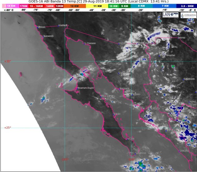 La CONAGUA pronostica que para el próximo sábado y domingo continuarán las condiciones meteorológicas favorables para nublados y tormentas convectivas aisladas, con precipitaciones menores de 25 mm, pero con puntuales mayores. Prevalecerá el ambiente muy caluroso, con temperaturas cercanas a 40°C o mayores en el noroeste y centro de Sonora.