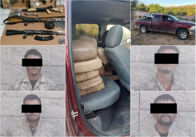 La Policía Estatal de Seguridad Pública (PESP) en coordinación con los tres niveles de gobierno lograron atender la denuncia y asegurar a cuatro personas que se encontraban armadas en Caborca y recuperar un automóvil robado que se localizó cargado con narcótico en las brechas de Átil, Sonora.
