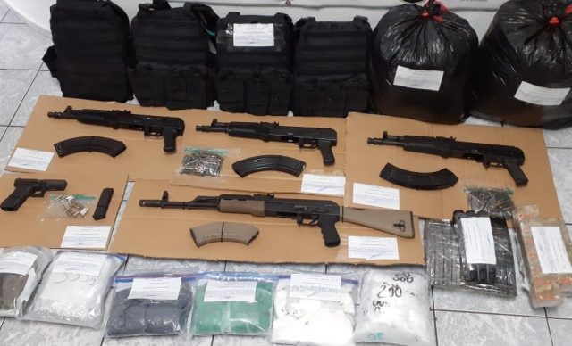 También aseguraron alrededor de 18 cargadores, más de 400 cartuchos, 10 bolsas conteniendo hierba verde, más de 400 envoltorios de polvo blanco, similar a un narcótico y cuatro chalecos balísticos.