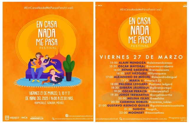 Artistas de España, Cuba, Argentina, Bolivia, Puerto Rico, Estados Unidos y México, se unieron con el Ayuntamiento de Hermosillo, a través del Instituto Municipal de Cultura y Arte (IMCA), para participar en el Festival Virtual #EnCasaNadaMePasa, una iniciativa de la alcaldesa Celida López que llevará a música a todos los hogares en este periodo de contingencia por el Covid-19.