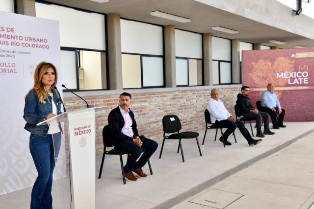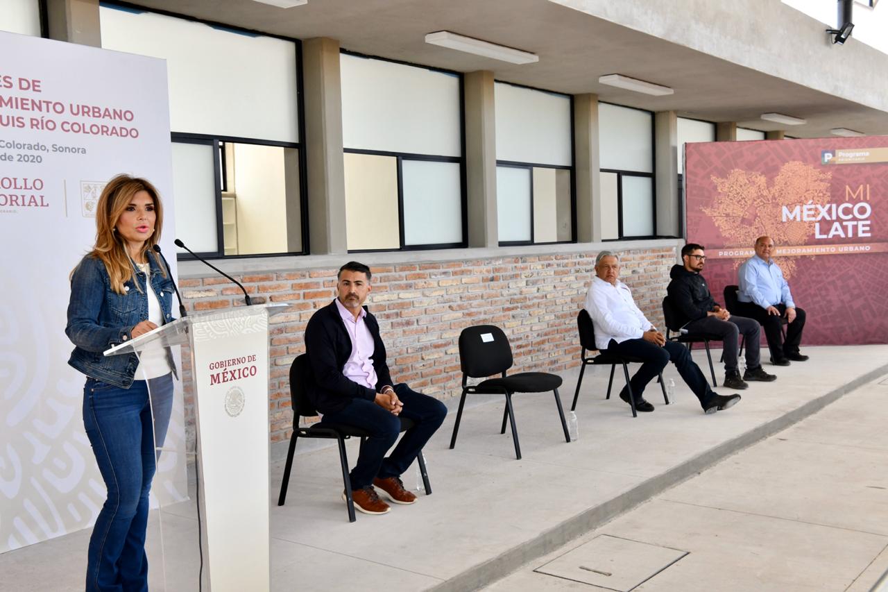 Román Guillermo Meyer Falcón, secretario de Desarrollo Agrario, Territorial y Urbano, ante la gobernadora Claudia Pavlovich Arellano, el presidente Andrés Manuel López Obrador, Santos González Yescas, presidente municipal de San Luis Río Colorado y Edgar González Savín, director de la oficina de la Presidencia para la Promoción y el Desarrollo del Beisbol en México, expuso los resultados que se han tenido en este municipio con el Programa de Mejoramiento Urbano, con el que se han realizado mil acciones de vivienda en el sector norte de esta ciudad.