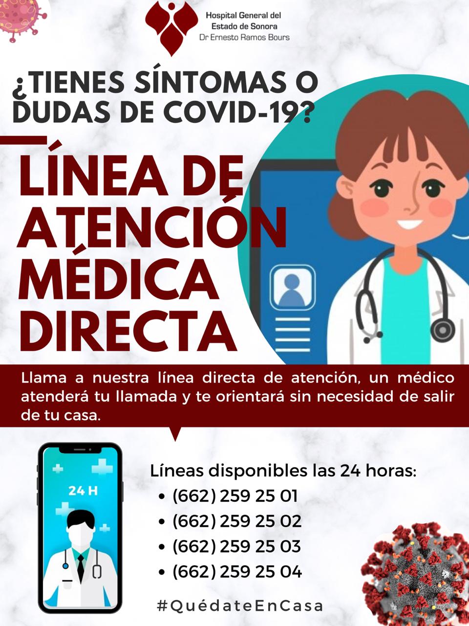 | En el Hospital General del Estado de Sonora “Dr. Ernesto Ramos Bours” fueron habilitadas líneas telefónicas destinadas a atender a pacientes con síntomas de Covid-19 como fiebre, tos, malestar en general, dificultad para respirar, con la finalidad de que las personas no se expongan y puedan atenderse desde casa, informó Marcos José Serrato Félix. El director del Hospital General del Estado detalló que son 4 líneas telefónicas en total las que se pondrán a disposición de la población, con el fin de dar consultas telefónicas a pacientes que presenten síntomas Covid-19 y no saturar los hospitales. “Porque queremos que estén a salvo en su casa, los ayudamos si tienen dudas acerca de cualquier enfermedad o bien, del nuevo coronavirus Covid-19 ponemos a tus ordenes en esta institución el Servicio de Atención Medica vía telefónica”, indicó Serrato Félix. Por su parte, Joaquín Sánchez González, director Médico del Hospital General del Estado, llamó a las personas a que tomen conciencia y se queden en casa y si alguien presenta síntomas iniciales o leves que haga su consulta vía telefónica y se mantenga en contacto para seguimiento. Es importante mencionar que estas líneas telefónicas estarán disponibles las 24 horas del día y serán atendidas por médicos especialistas, quienes canalizarán a los pacientes y determinarán si su tratamiento es domiciliario u hospitalario. Las líneas telefónicas habilitadas son: (662) 259 25 01; (662) 259 25 02; (662) 259 25 03 y (662) 259 25 04, y se hace un llamado a la población a hacer un uso responsable de ellas. |
