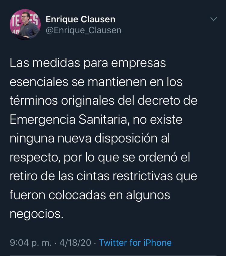 Precisó que las medidas para empresas esenciales se mantienen en los términos originales del decreto de Emergencia Sanitaria.
