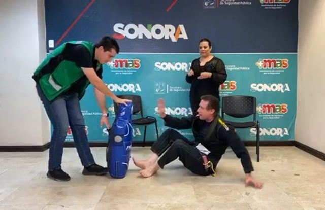 El instructor de Jiu Jitsu abundó que la forma correcta de levantarse al estar sentado en el piso es primeramente avanzar hacia atrás apoyado con las manos y los glúteos lo que permite mayor rapidez para ponerse de pie y correr .