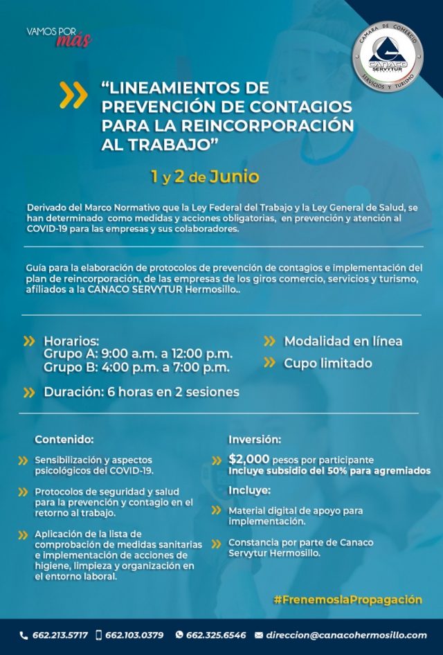 Derivado del Marco Normativo que la Ley Federal del Trabajo y la Ley General de Salud, han determinado como medidas y acciones obligatorias en prevención y atención al COVID-19 para las empresas y sus colaboradores, CANACO SERVYTUR Hermosillo instruirá a sus agremiados.