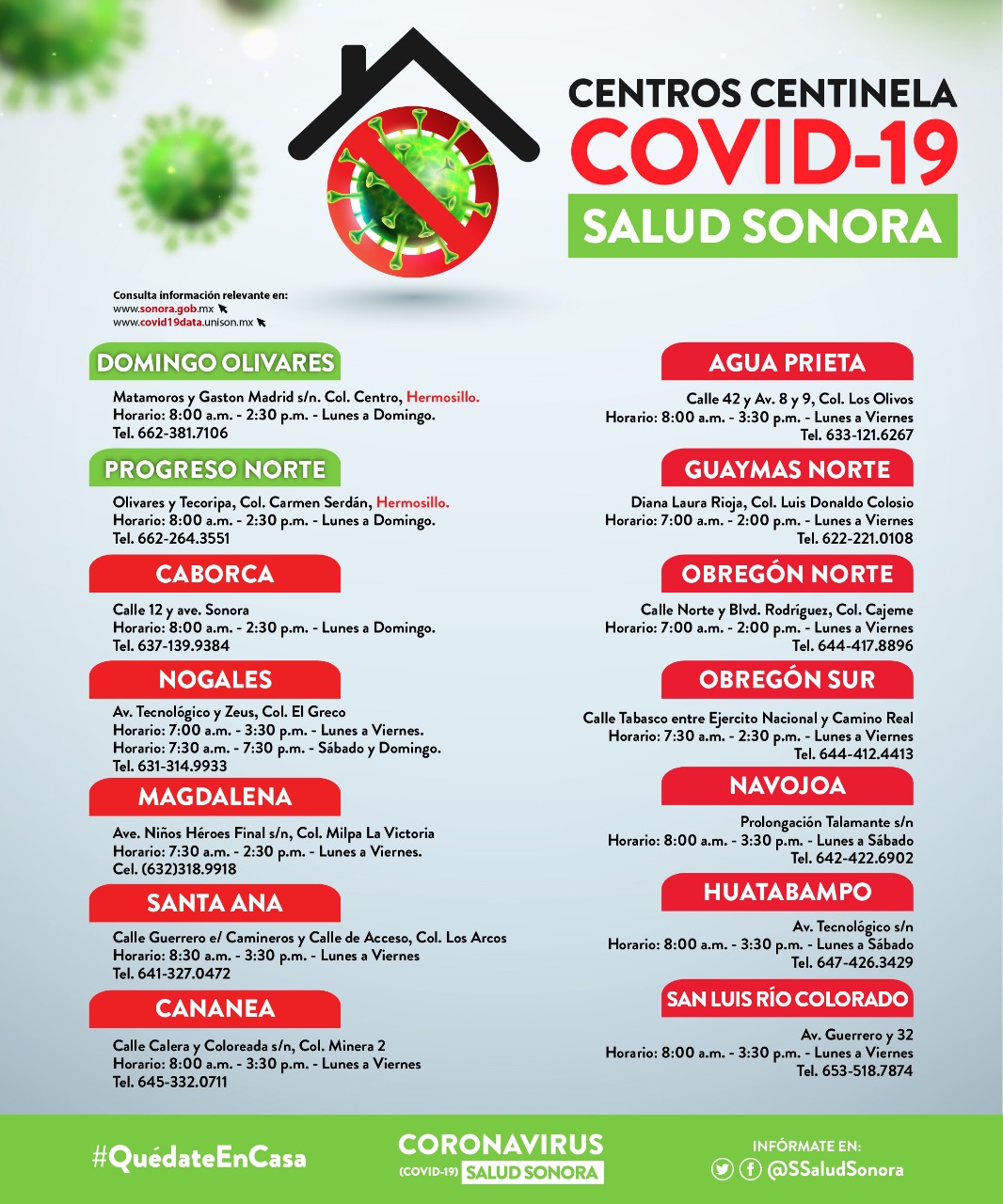 Detalló que las 14 Unidades Centinelas en operación están en: Hermosillo (2), Caborca, Nogales, Magdalena, Santa Ana, Cananea, Agua Prieta, Guaymas, Ciudad Obregón(2), Navojoa, Huatabampo, San Luis Río Colorado.