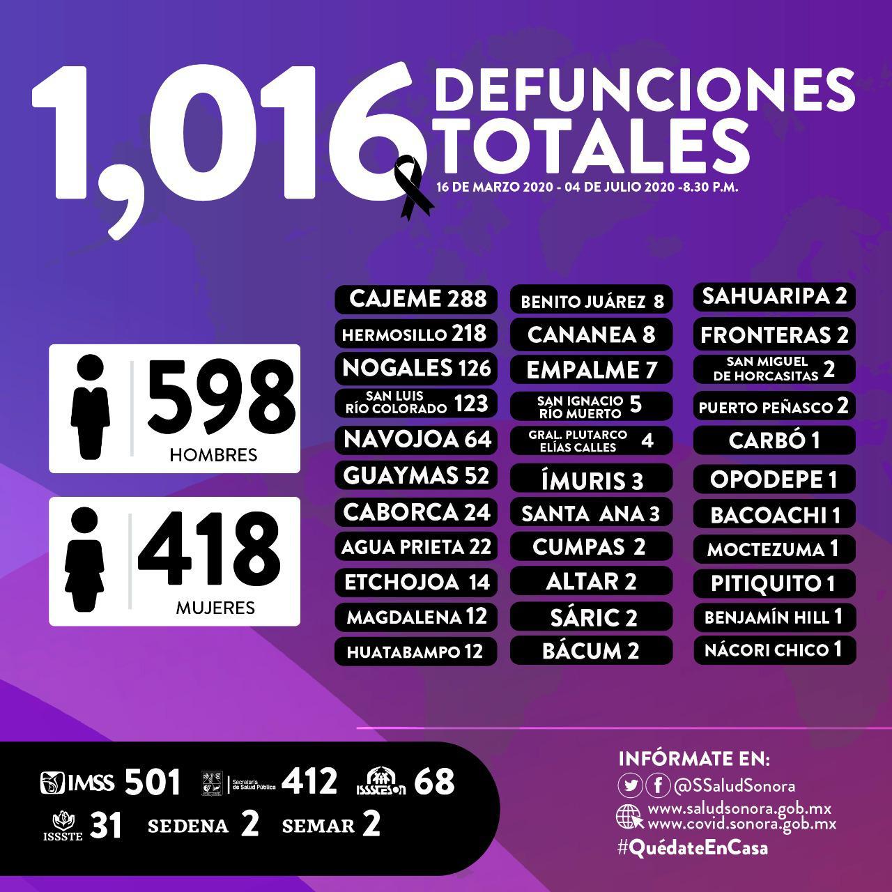 El secretario de Salud en Sonora señaló que en el 80% de los casos el virus no “pega fuerte” cuando es detectado a tiempo y se inicia tratamiento prescrito por médicos, por lo que,resaltó, es indispensable poner atención a los síntomas y acudir al hospital, unidades médicas o, con previa cita, a los Centros Centinela, en caso de ser grupo de riesgo como padecer enfermedades crónico degenerativas, tener obesidad, adulto mayor de 50 años o mujer embarazada, no se requiere de cita. “Escucha a tu cuerpo, hazle caso y no dejes de ir al doctor, a tu Centro de Salud o un Centro Centinela ante el primer síntoma. No dejes llegar el octavo día, ha sido tan buena la respuesta al programa Anticipa que te voy a pedir de favor que antes de ir a un Centro Centinela, primero llames para hacer la cita”, expresó. En su caso personal, explicó, el jueves dio positivo a Covid-19, eso, dijo, indica que el virus ya estaba en su cuerpo entre cuatro y cinco días, y tiene cuatro días más con tratamiento recetado por médicos, por lo que entre domingo y lunes, cumplirá su octavo día con Covid. “Entre mañana y pasado mañana, sabré si el virus se me complica, según estudios, o con el favor de Dios inicie mi proceso hacia la recuperación, confío en que así será, porque 80 por ciento de los casos, el virus no pega tan fuerte cuando es detectado a tiempo, y más cuando nos atendemos de “volada””, reiteró. Ana Galaviz Barreras, psicóloga del Hospital General del Estado, invitó a los sonorenses a respetar las medidas de distanciamiento social y ser solidarios con el personal de salud de día a día arriesga su vida en la atención a pacientes de Covid-19. Este día, informó, se presentaron 26 fallecimientos y 264 nuevos casos por Covid-19 en Sonora. Al brindar su solidaridad a las familias de las personas que perdieron la vida por este virus, indicó que los 26 fallecimientos ocurrieron en: 15 hombres y 11 mujeres entre 22 y 85 años de edad residentes de: Hermosillo 13; Guaymas, cinco; Nogales y Cajeme, dos cada uno, Empalme, Agua Prieta, San Ignacio Río Muerto y Plutarco Elías Calles, uno cada uno. Los 264 casos ocurrieron en 138 mujeres y 126 hombres residentes de: Caborca 53; Cajeme 48; Hermosillo 46; Nogales 29; Navojoa 22; Agua Prieta 15; San Luis Río Colorado 14; Huatabampo 11; Plutarco Elías Calles, cinco; Guaymas, cuarto; Altar, tres; Puerto Peñasco, Etchojoa, Ures, Álamos y Pitiquito, dos cada uno; Benito Juárez, Moctezuma, Empalme y San Ignacio Río Muerto, uno cada uno; entre ellos dos casos pediátricos, en un niño y una niña, ambos de 12 años residentes de Álamos y Agua Prieta, acumulándose 90 casos pediátricos. Hoy se confirmaron siete casos en mujeres embarazadas residentes de: Nogales, cuatro; Plutarco Elías Calles, Altar y Cajeme, uno cada uno, acumulándose 92 casos de Covid-19 en mujeres embarazadas. De los 264 casos de hoy, 55 ocurrieron en trabajadores de la salud: Cajeme 22; Hermosillo y Navojoa 10 cada uno; Nogales, cuatro; Caborca, tres; Agua Prieta, dos; Moctezuma, Etchojoa, Puerto Peñasco y Guaymas, uno cada uno. Casos Covid-19 en Sonora Mujeres: 11 Institución Médica Casos confirmados el 4 de julio: 264 Mujeres: 138 Institución Médica Acumulados Mujeres: 418 Institución Médica Total de Casos confirmados: 10,065 Mujeres: 5,033 Institución Médica Casos estudiados: 16,054 |