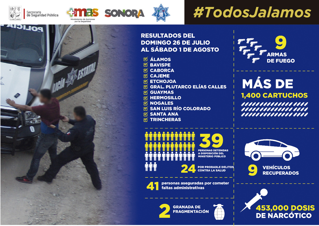 La Policía Estatal de Seguridad Pública (PESP) en operativos por Sonora detuvo a 39 personas por diversos delitos, principalmente por posesión de sustancias prohibidas y aseguró armas de fuego, cartuchos útiles y más de 453 mil dosis de drogas.