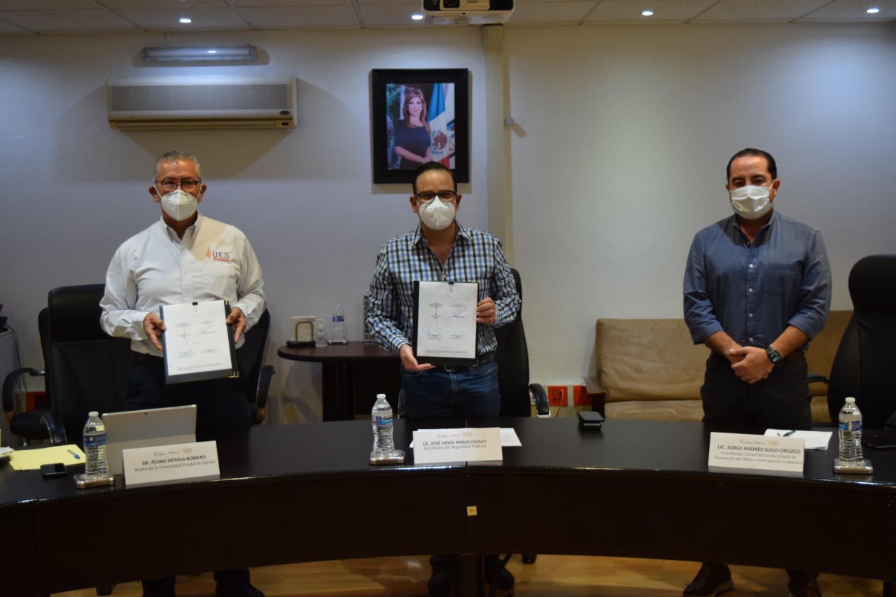 Atestiguaron la firma de convenio, el coordinador del Centro Estatal de Prevención del Delito y Participación Ciudadana, Jorge Andrés Suilo Orozco y, de manera virtual, Mariza Aguirre Fimbres, secretaria general Académica de la UES.