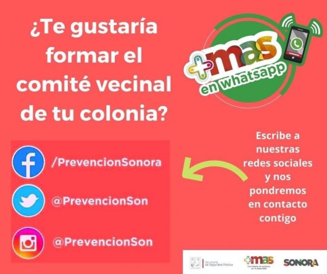 Indicó que los ciudadanos que deseen sumarse a la Construcción de la Seguridad en su comunidad pueden conformar sus comités vecinales y, posteriormente, solicitar su incorporación a los grupos de “MAS en Whatsapp”, a través de las redes sociales del Centro Estatal de Prevención del Delito y Participación Ciudadana, en Facebook /prevencionsonora, Twitter e Instagram @prevencioson.