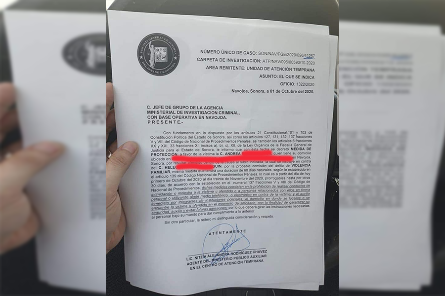 Andrea Ramírez, esposa del ex alcalde de Huatabampo y ex subsecretario de inclusión social en el gobierno estatal acudió a interponer una denuncia ante el ministerio público por violencia familiar por lo cual le fue otorgada una medida de protección de 60 días para evitar actos de intimidación o molestia contra su persona de parte del ahora ex funcionario público.