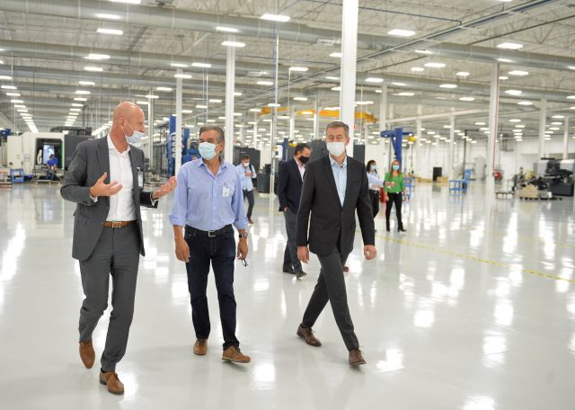 Hans Steininger, director ejecutivo de MT Aerospace AG, Alberto Federico Terrazas Seryffert-presidente ejecutivo de Grupo Punto Alto, y el secretario de Economía realizaron un recorrido por la planta AT Engine, donde constataron las condiciones de esta empresa aeroespacial para dar inicio a sus operaciones el próximo mes de febrero.