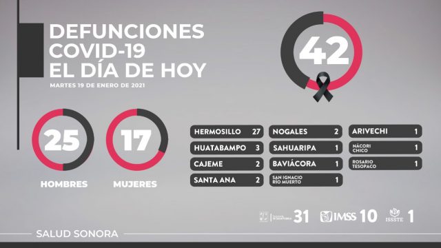 Este martes, 21 pacientes fueron dados de alta; hasta el momento, 50 mil 514 personas se han recuperado en la entidad; también se confirmaron 42 decesos en 25 hombres y 17 mujeres, 27 de ellos residentes de Hermosillo; tres de Huatabampo; dos de Santa Ana; dos de Nogales; dos de Cajeme; uno de Sahuaripa; uno de Baviácora; uno de San Ignacio Río Muerto; uno de Arivechi; uno de Nácori Chico y uno de Rosario, 31 de las personas fallecidas eran derechohabientes de la Secretaría de Salud; 10 del IMSS y uno del Issste, con lo que se acumulan 4 mil 576 defunciones.
