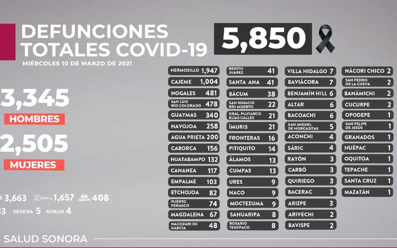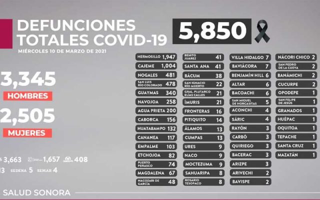 Las 11 defunciones registradas fueron en ochos hombres y tres mujeres residentes de Hermosillo cuatro; Navojoa, Cajeme y San Luis Río Colorado dos cada uno; Caborca uno; derechohabientes del IMSS seis, Secretaría de Salud cuatro; Isssteson uno; acumulándose 5 mil 850 defunciones.