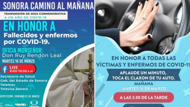 El secretario de Salud en Sonora explicó que este 16 de marzo, a las 9:00 horas se oficiará por parte del Arzobispo de Hermosillo Don Ruy Rendón Leal una misa conmemorativa, que será transmitida por Televisa y Telemax y también en vivo por Facebook en las cuentas de la dependencia y del Gobierno del Estado. Agregó que a las 12:00 horas, junto a la mandataria estatal sostendrán una conferencia virtual con el boxeador Óscar Valdez, campeón súper pluma del CMB, también por las citadas televisoras y transmisión en vivo de Facebook, quien enviará un mensaje de superación a las y los sonorenses. ‘’Óscar Valdez nos compartirá un mensaje de superación, cómo aún en tiempos difíciles se puede salir adelante, sobre todo los tiempos tan complicados que ha traído para todos esta pandemia’’, declaró. Además, invitó a sumarse a un acto conmemorativo que será encabezado también por la mandataria estatal, a las 14:30 horas, el cual consiste en participar con un minuto de aplausos o tocar el claxon justo a esa hora, acciones que se realizarán a manera de homenaje en las explanadas de los hospitales de la Secretaría de Salud en el estado y, en el caso de Hermosillo, a las afueras del Hospital General del Estado. ‘’Te invito a unirte a un acto conmemorativo en recuerdo de los fallecidos y para pedir por la salud de los enfermos de COVID-19 así como por todo nuestro personal de salud que sigue en la batalla contra este virus; mañana a las 2:30 de la tarde, por un minuto, aplaude o toca tu claxon en honor a ellos’’, señaló. |