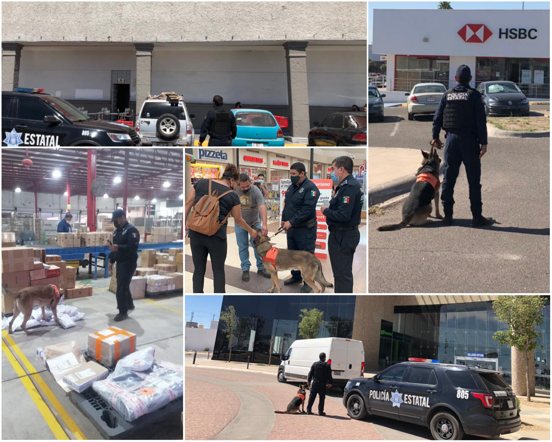 Los binomios caninos colaboran en el operativo permanente de la Policía Estatal con patrullajes de vigilancia en los comercios y zonas bancarias para prevenir e inhibir el delito.