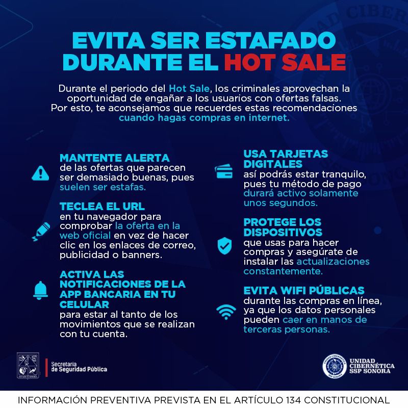 Para evitar que las personas que realizarán compras por internet durante el Hot Sale o gran venta de fin de semana sean víctimas de estafa, la Unidad Cibernética de la Secretaría de Seguridad Pública (SSP) de Sonora, recomendó extremar medidas de prevención y verificar la autenticidad de las páginas.