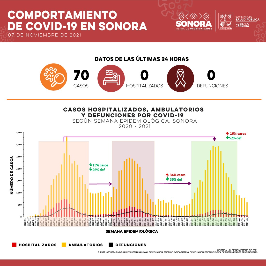 La Secretaría de Salud de Sonora (SSA) confirmó este día 70 nuevos casos por Covid-19 y ninguna defunción a causa de la enfermedad.