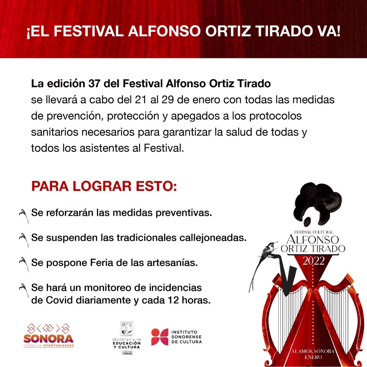 A partir de este viernes 21 de enero, Álamos será sede de la 37 edición Festival Alfonso Ortiz Tirado, apegados a los más estrictos protocolos de salud y con un monitoreo diario de incidencias de Covid-19 diariamente, cada 12 horas, para garantizar el bienestar de sus asistentes.
