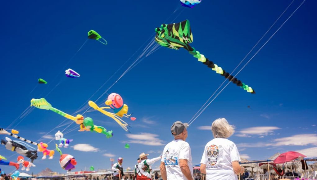 Viste Sky Fest de colores el cielo de Bahía de Kino con papalotes gigantes
